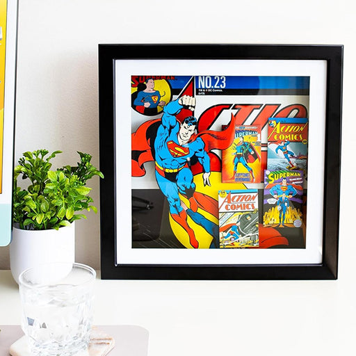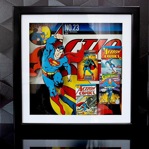 View full detailsThis comic art is super deep! The Superman Wood Shadow Box boasts a 3-D layout of 4 classic Superman DC comic covers, with Supes flying out of th...